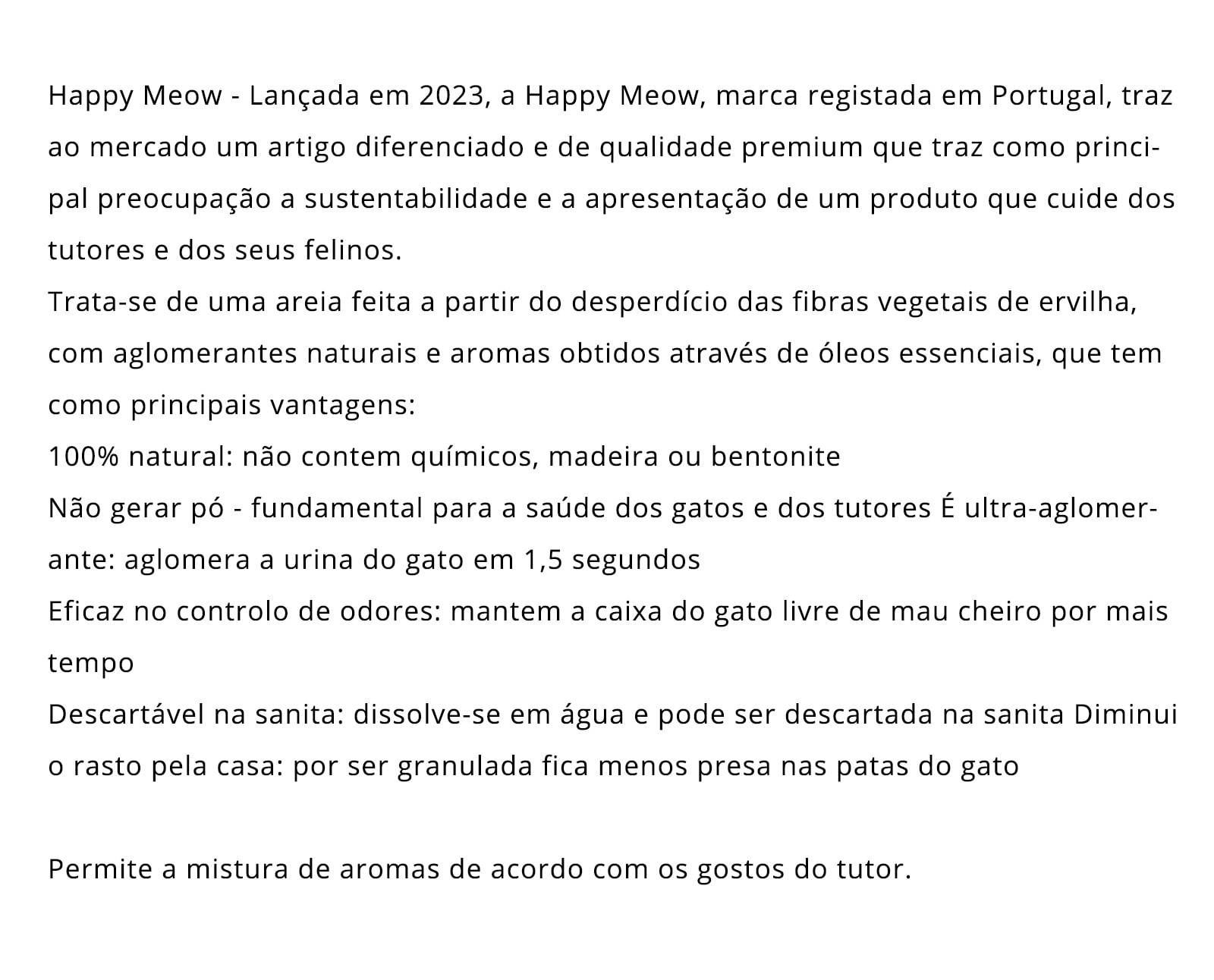 Com a Happy Meow comercializamos areia de tofu para gato. Trata- se de uma areia 100% vegetal, obtida através do desperdício de fibras de ervilha/tofu e aglomerante natural, que permite uma experiÊncia sem pó e altamente efica do ponto de vista da aglomeração e controlo de odores. Por ser totalmente vegetal pode ser descartada na sanita, onde se dissolve.