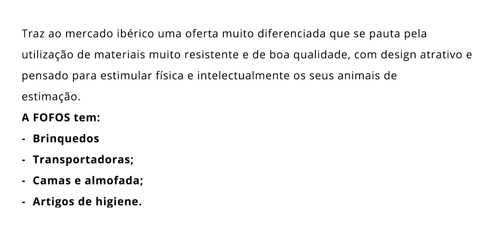 Em 2024, a nossa paixão pelos animais levou-nos a apostar na FOFOS, uma marca que alia qualidade e design inovador às necessidades físicas e de estimulação cognitiva dos cães e gatos. A FOFOS reflete o nosso desejo de proporcionar bem-estar e felicidade aos nossos companheiros de quatro patas, sem comprometer os nossos valores de sustentabilidade.